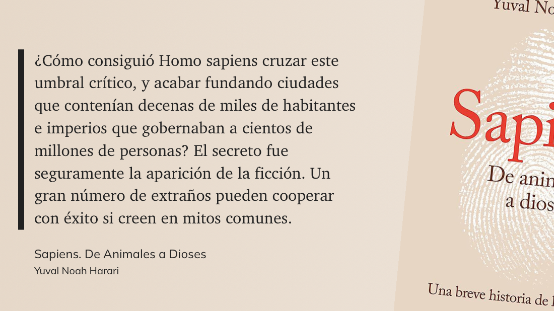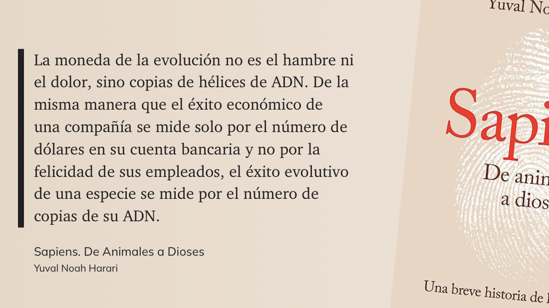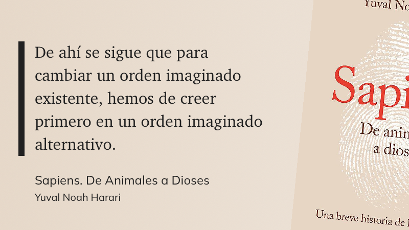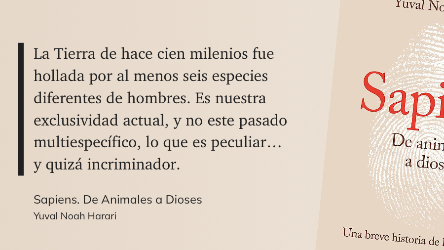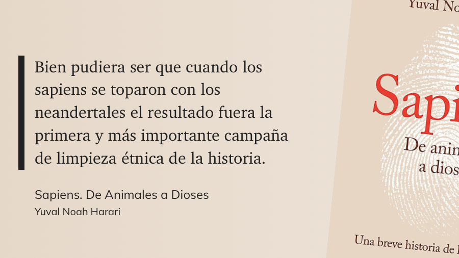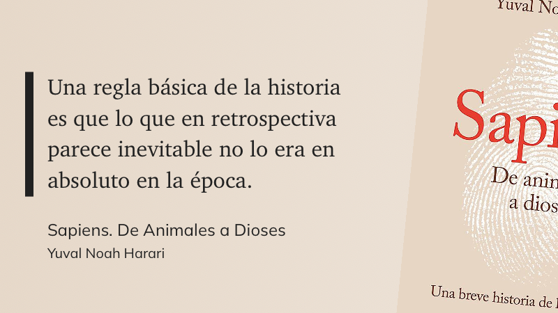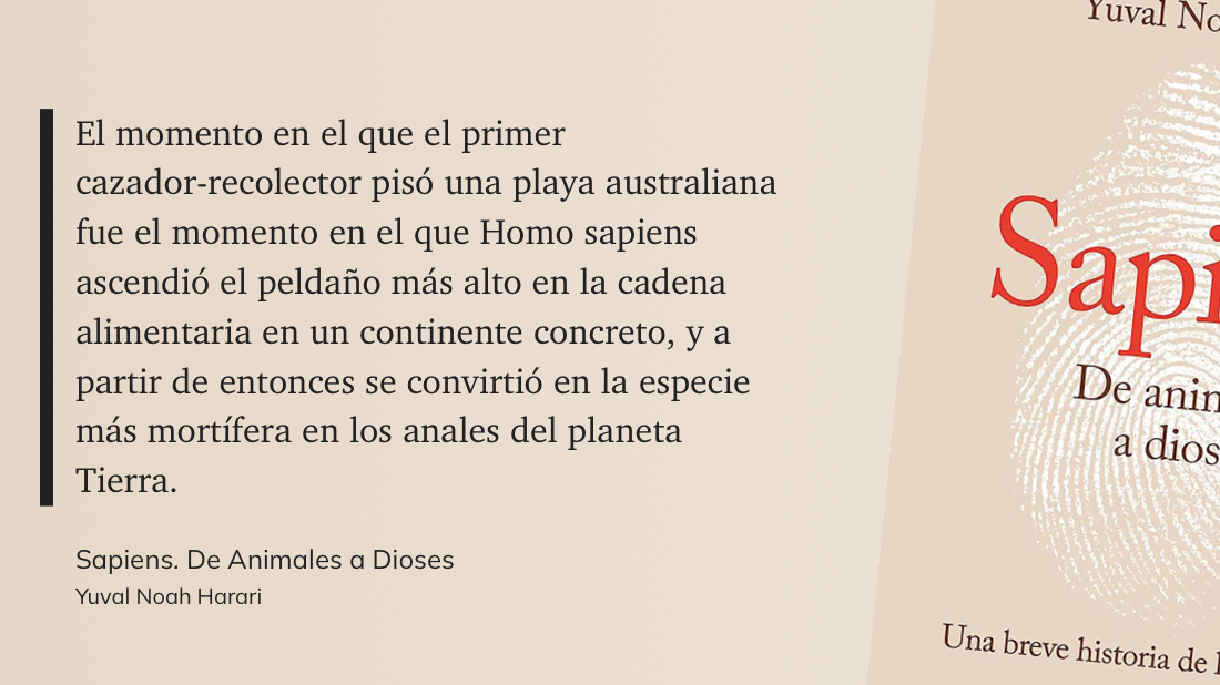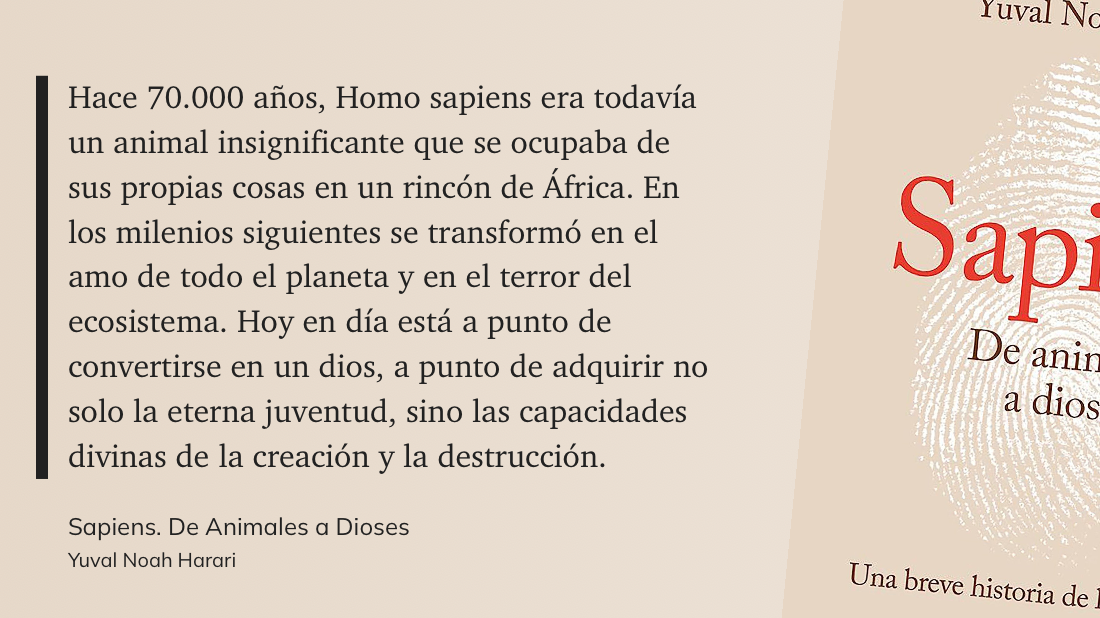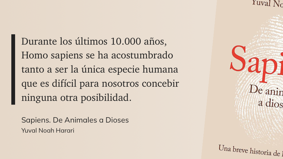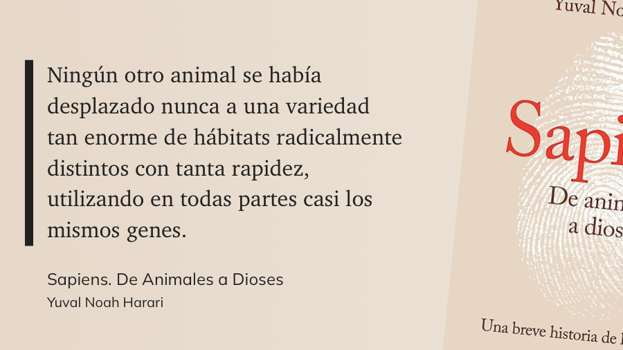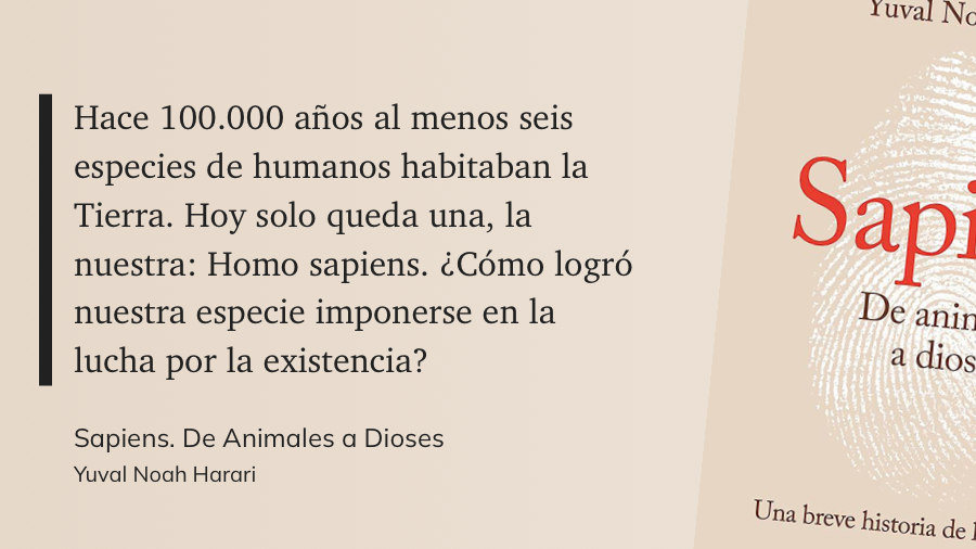 Sapiens, de animales a Dioses: Breve historia de la humanidad. Creo que el titulo es un poco auto explicativo. Es un relato desde los primeros días del ser humano, pasando por la actualidad y dando un pequeño vistazo imaginario a lo que podría ser el siguiente paso evolutivo. Fue uno