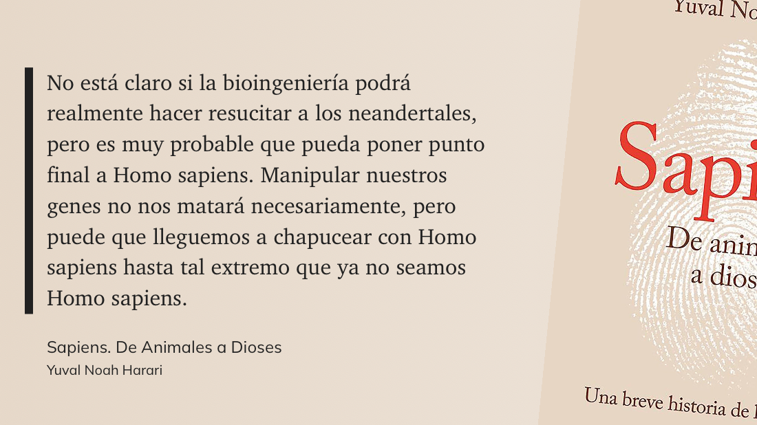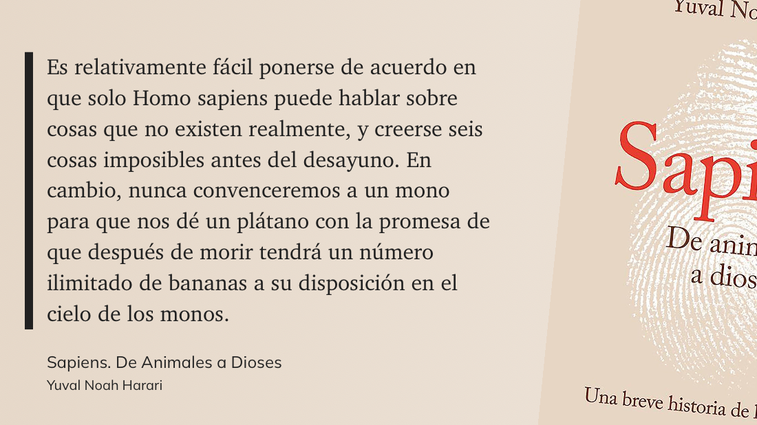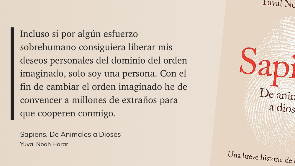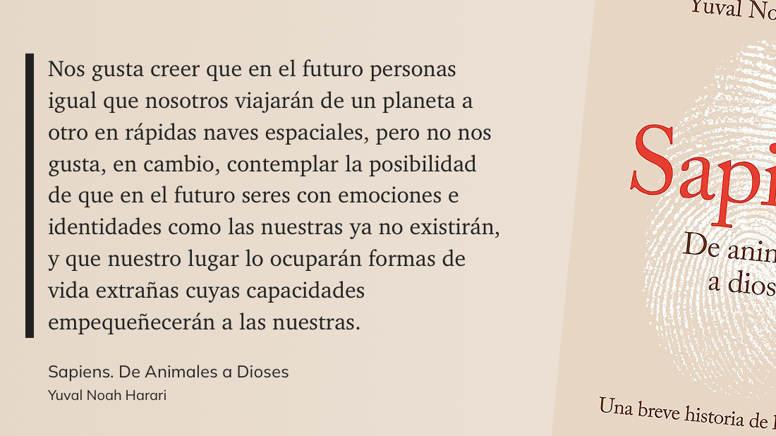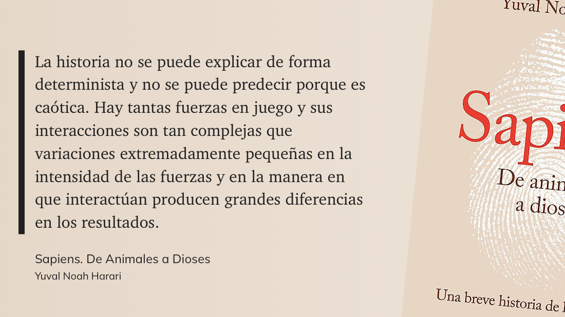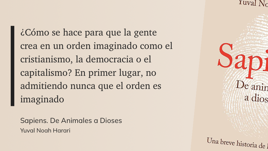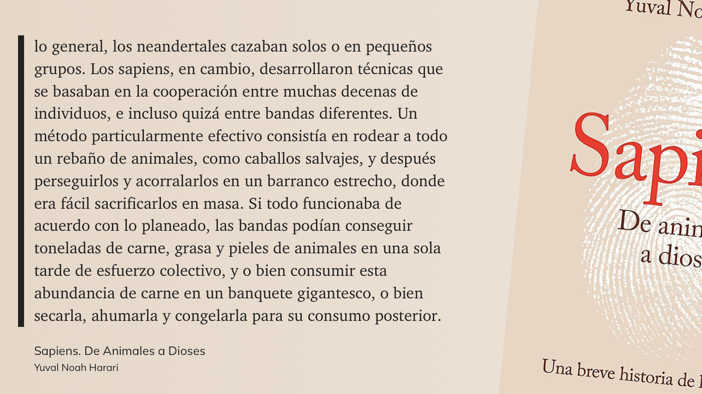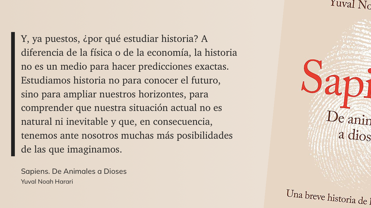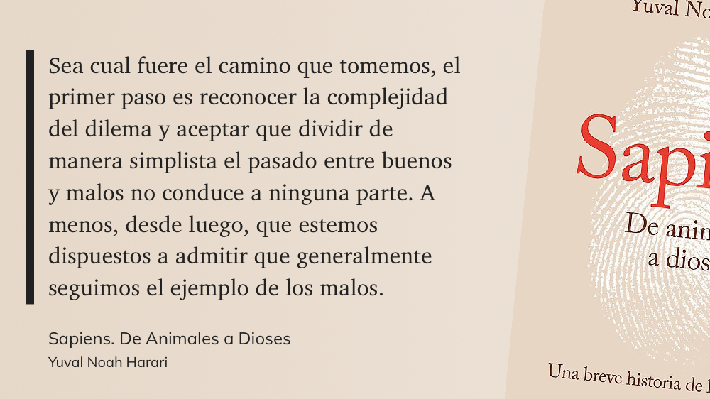 Sapiens, de animales a Dioses: Breve historia de la humanidad. Creo que el titulo es un poco auto explicativo. Es un relato desde los primeros días del ser humano, pasando por la actualidad y dando un pequeño vistazo imaginario a lo que podría ser el siguiente paso evolutivo. Fue uno